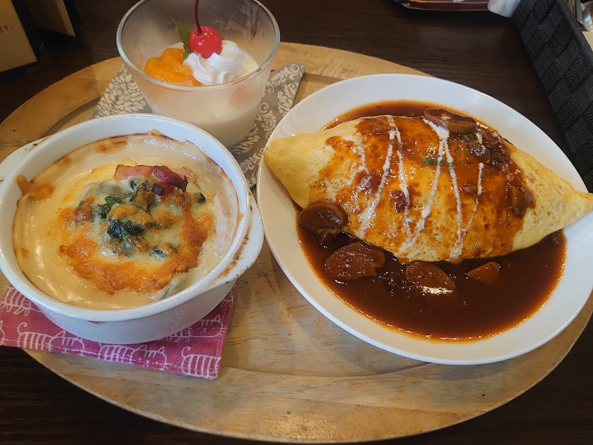 The menu centers around well-made comfort dishes with a Japanese cafe twist. The オムライス (omelette rice) stands out, especially with its choice of sauces—ketchup, hashed beef demi-glace, or white sauce. The demi-glace is a particular favorite, pairing a neatly folded, slightly firm egg with chicken rice that’s flavored distinctly and generously. Portions are generous, and the lunch set, which includes salad and a drink, offers good value for those wanting a proper midday meal. Plus, during lunch, you can get a free large serving, a nice bonus for bigger appetites.