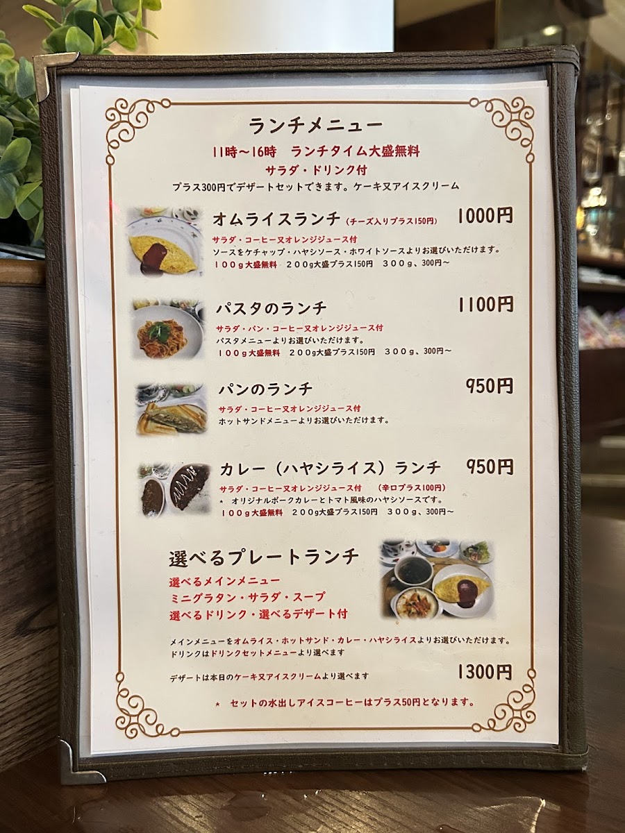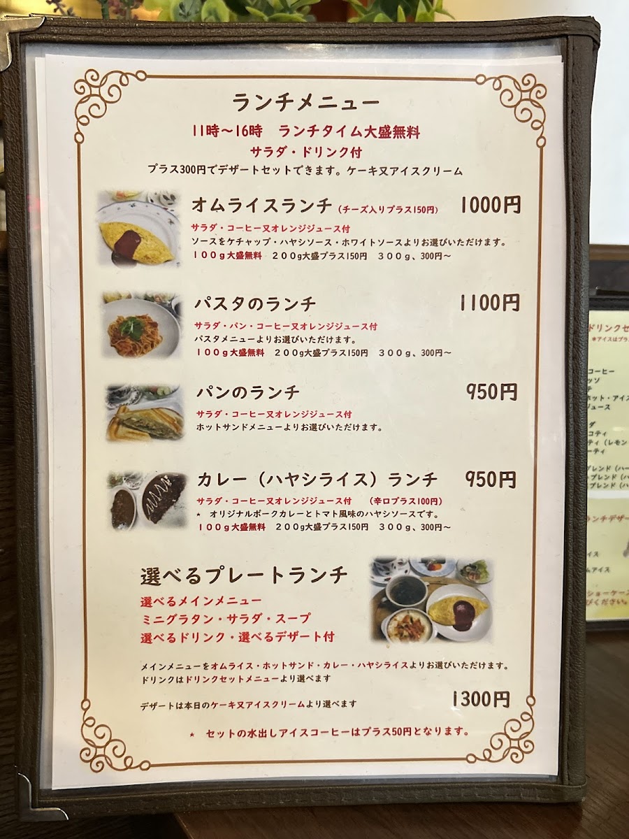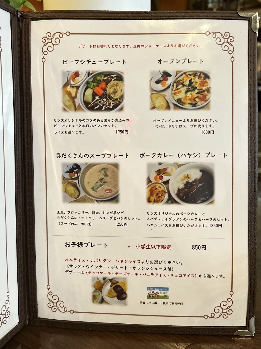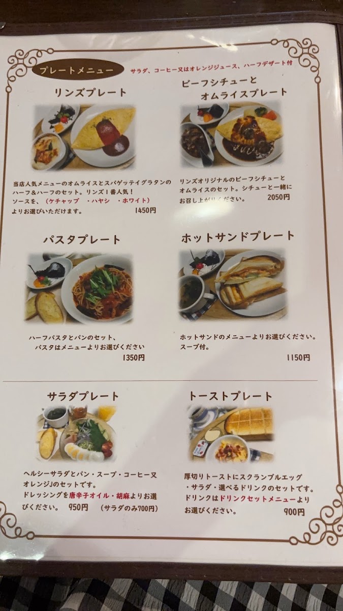 Food selections include hot sandwiches, various styles of omurice with choices of sauces such as demi-glace, hayashi, and white sauce, and pasta dishes including cream soup pasta and pasta plates. There are also set plates available that typically include salad and dessert, such as the "リンズプレート" and lunch plates that allow choice of cake.