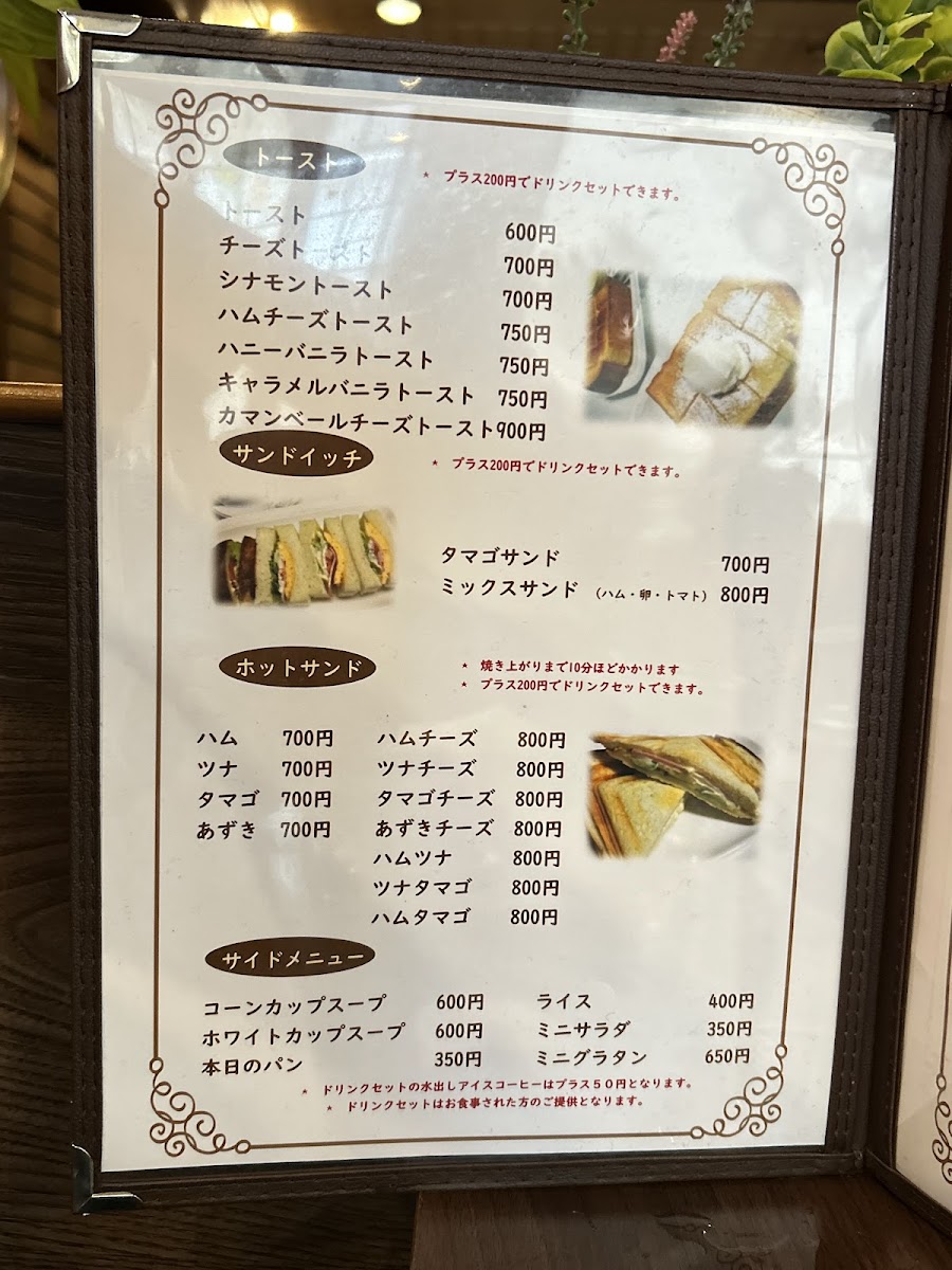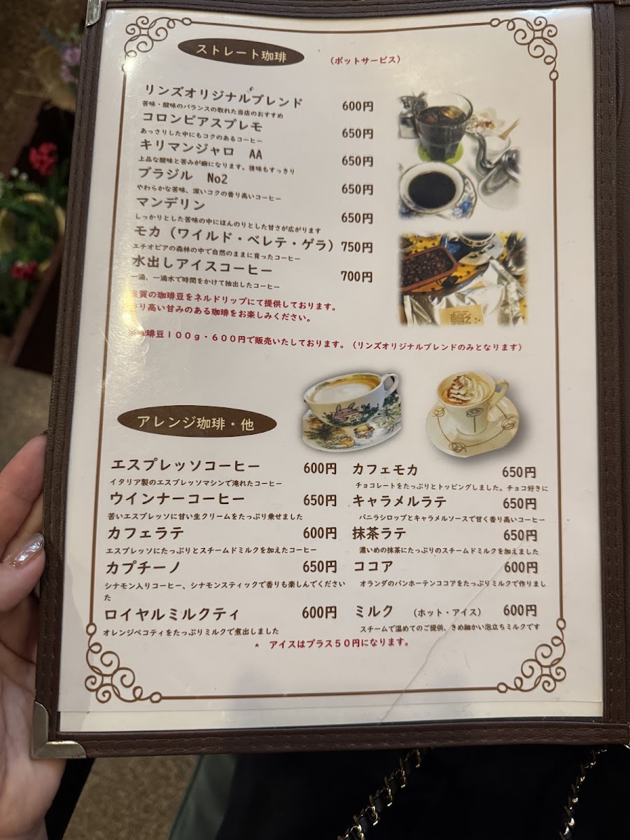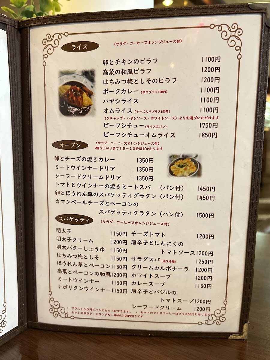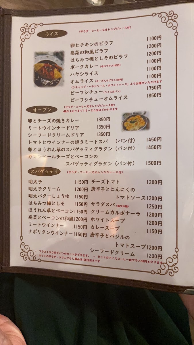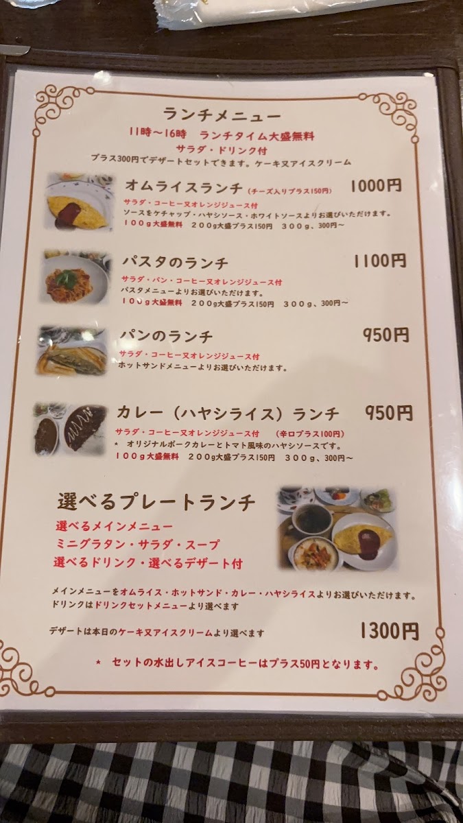 Food selections include hot sandwiches, various styles of omurice with choices of sauces such as demi-glace, hayashi, and white sauce, and pasta dishes including cream soup pasta and pasta plates. There are also set plates available that typically include salad and dessert, such as the "リンズプレート" and lunch plates that allow choice of cake.